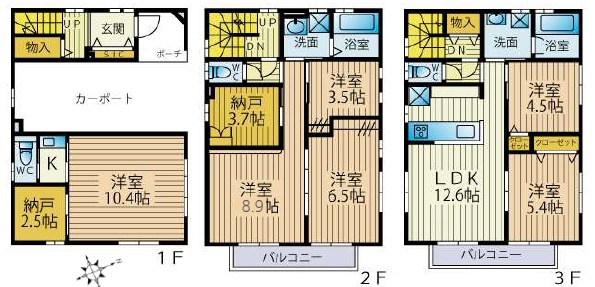 | 構造 | 木造 3階建 | 駐車場 | 有/ 2台(カーポート・青空) |